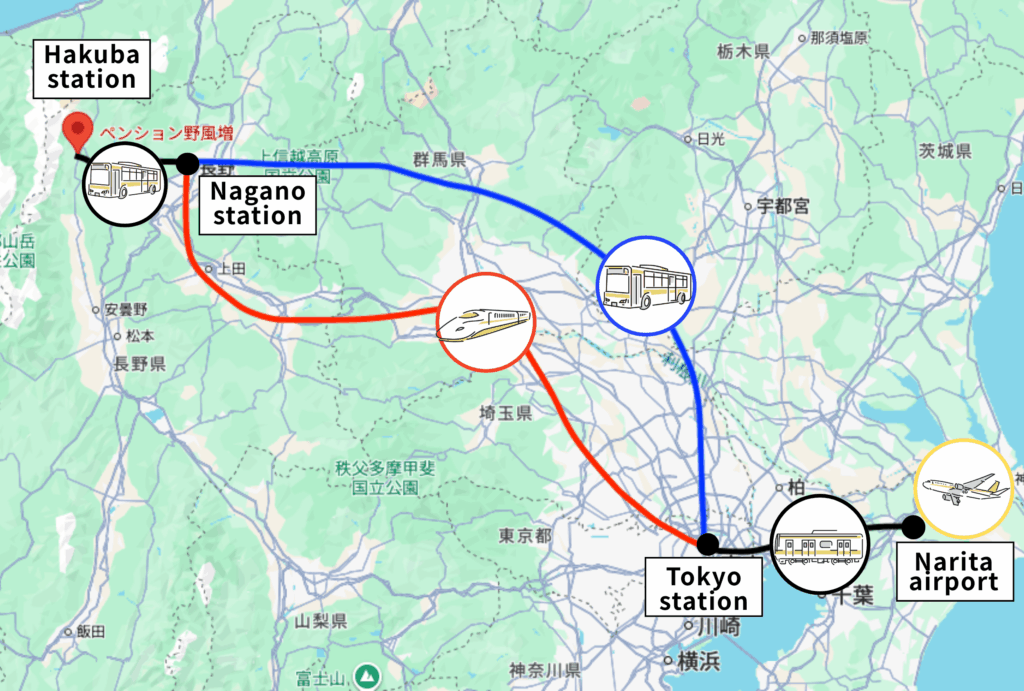野風増までの道のり 成田空港から東京駅 成田エクスプレス / 約1時間 成田エクスプレスの確認はこちら 東京駅から長野駅 北陸新幹線 / 約1時間30分 アルピコ交通 / 約4時間 北陸新幹線の確認はこちら アルピコ交通の確認はこちら 長野駅から白馬駅 アルピコ交通 / 約1時間20分 アルピコ交通の確認はこちら